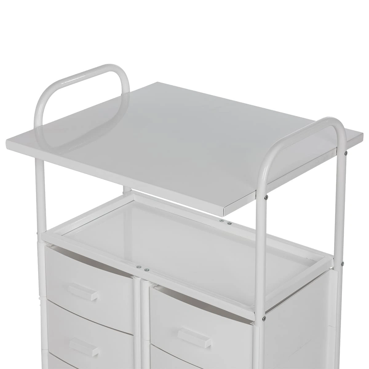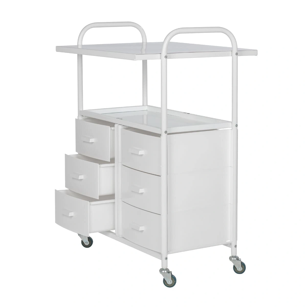 Для инструментов, аксессуаров и расходных материалов достаточно места в шести выдвижных ящиках. Полки можно использовать как для необходимых приспособлений, так и для установки небольших аппаратов. Несомненным плюсом косметологического оборудования являются встроенные маневренные колесики. Мастер без особых усилий может перемещать косметологическую тележку по рабочей зоне.