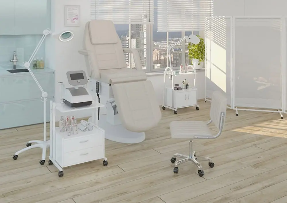 Каркас из прочной стали установлен на надежное основание, закрытое пластиковой накладкой. Металлические элементы покрыты порошковой краской для защиты от влаги, коррозии и косметических средств. Наполнитель педикюрного кресла – упругий поролон. Обшивка из качественной экокожи обладает водостойкими свойствами. Поверхность легко чистится и не боится дезинфицирующих средств.