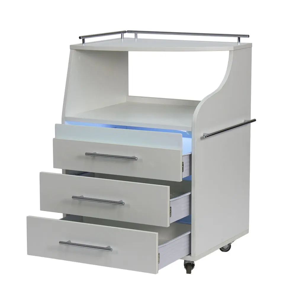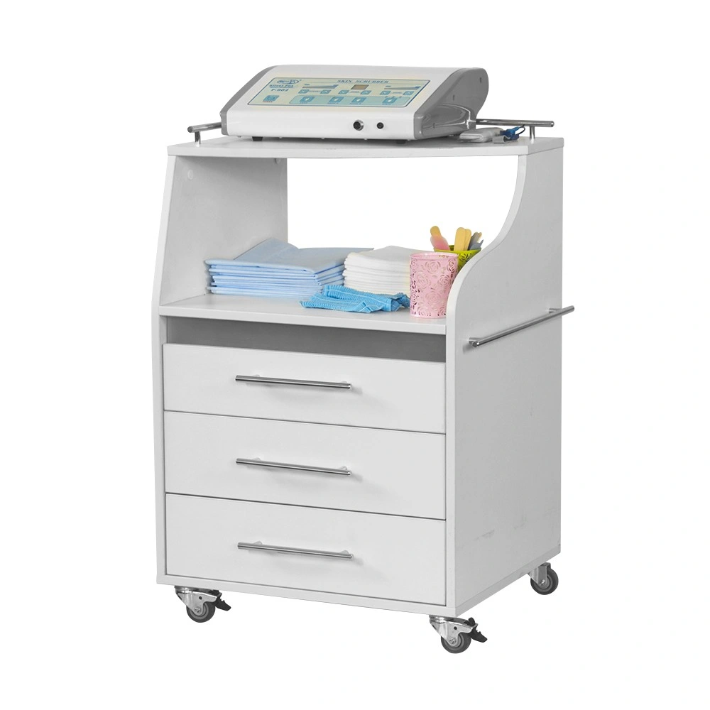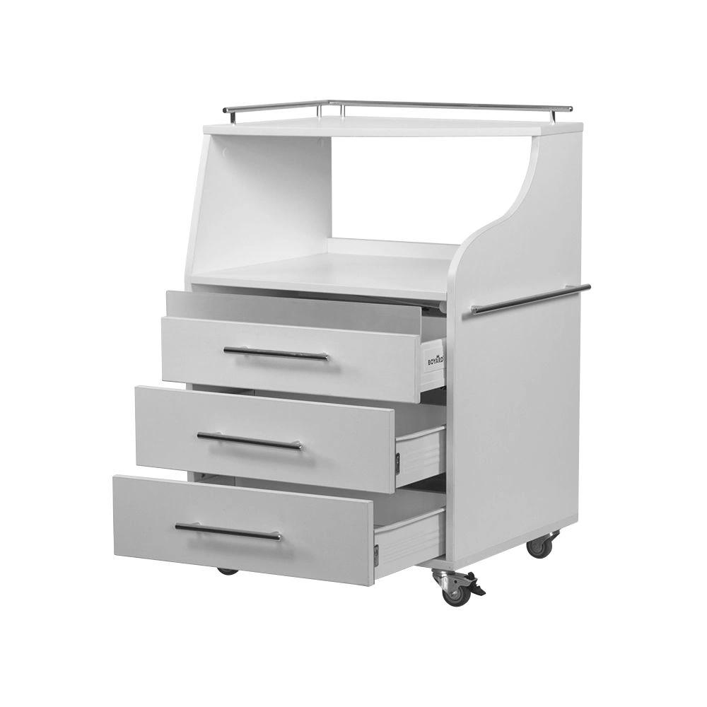 Косметологическая тележка разделена на 3 выдвижных ящика и две полки. Верхний ящик – ультрафиолетовая камера, в которой можно стерилизовать и хранить инструменты. Внутреннее пространство покрыто зеркальным отражателем. В остальных ящиках достаточно места, чтобы разложить приспособления мастера. Верхние полки предназначены для установки аппаратов или принадлежностей первой необходимости. Перемещать косметологическое оборудование можно с помощью вращающихся колес.