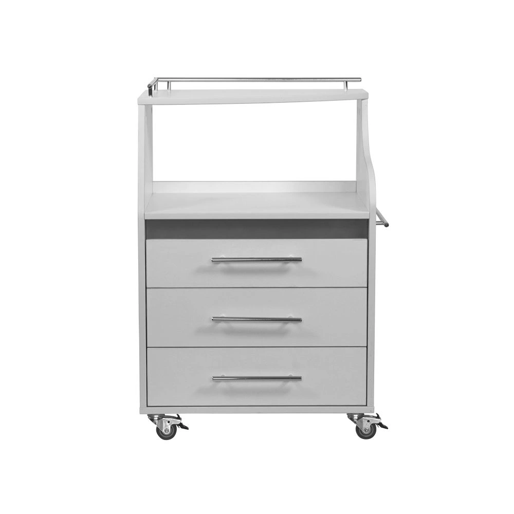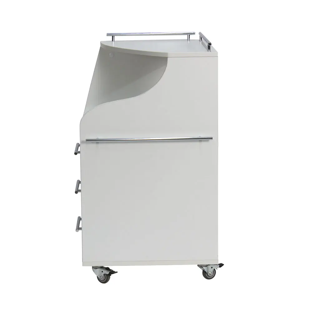 Тумба изготовлена из ЛДСП с водостойкими свойствами. Материал устойчив к обработке моющими и дезинфицирующими средствами. Все детали тумбы оклеены кромкой для защиты от намокания. Ящики в тумбе открываются и закрываются бесшумно за счет автоматического доводчика. Хромированные ручки придают оборудованию эстетически привлекательный внешний вид. Колеса из резины не повредят напольное покрытие.