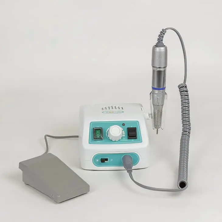Аппарат для маникюра включает блок питания и ручку с цанговым зажимом. На корпусе блока питания располагается регулятор скорости, реверс, углубления для расстановки фрез, держатель для ручки. Ручка с микромотором имеет удобный цанговый зажим, в котором устанавливаются необходимые фрезы. Замена инструмента занимает считанные секунды. С помощью удобной педали можно включить и выключить аппарат, когда руки мастера заняты. Для удобной транспортировки предусмотрена компактная сумка.