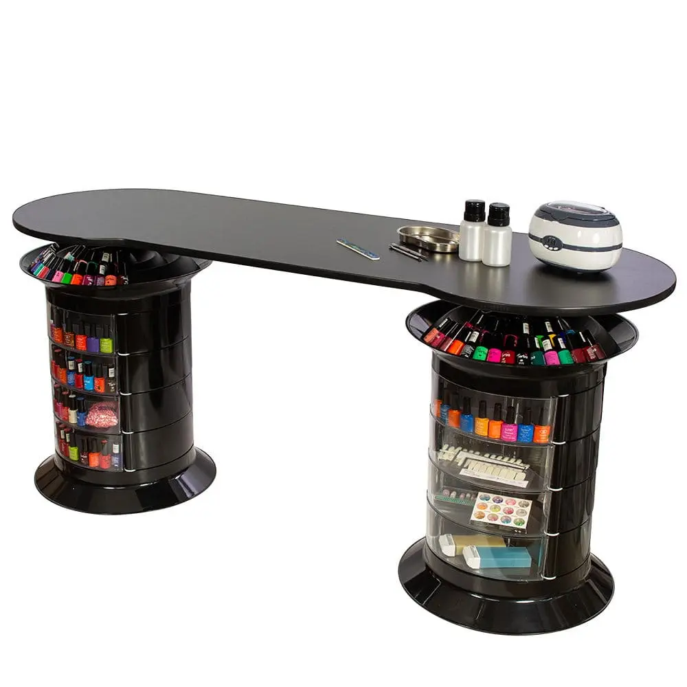 В распоряжении мастера 24 ящичка, в которых поместятся все инструменты и расходные материалы. Удобная раздвижная система позволит быстро найти и взять необходимые принадлежности. Над тумбой предусмотрена практичная крышка, разработанная специально для хранения лаков. Чтобы облегчить поиск нужных приспособлений, каждая тумба вращается вокруг своей оси. На столешнице достаточно места, чтобы поставить сопутствующее оборудование и разложить необходимые инструменты.