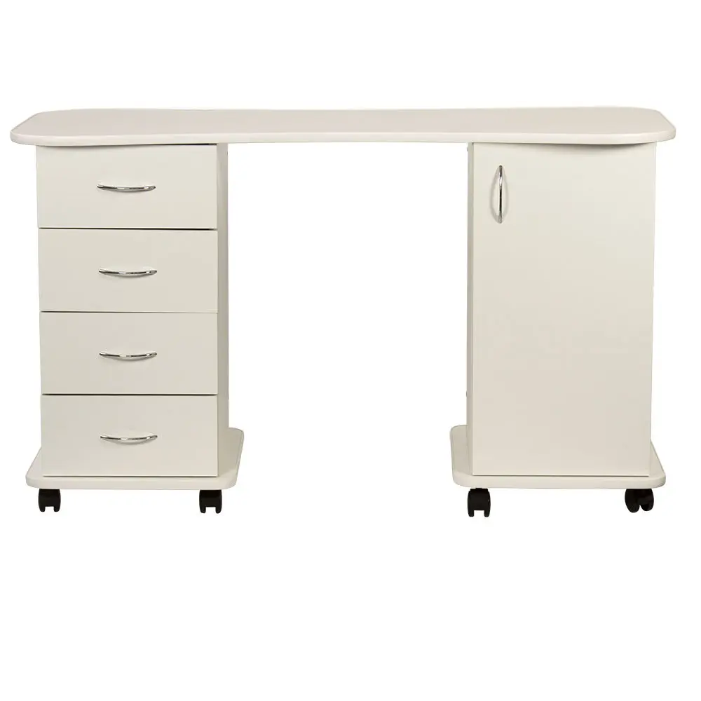 Если Вы желаете купить стильный и удобный стол для маникюра – Эсти-2 сможет полностью удовлетворить Ваши потребности. Он выполнен из качественной ламинированной ДСП, которая отличается высокой прочностью и долговечностью. Ламинированное покрытие легко очищается, не боится воздействия влаги и дезинфицирующих средств, а также длительное время сохраняет красивый внешний вид. Тумбы установлены на колеса, благодаря которым стол можно легко перемещать и поворачивать. В нашем магазине маникюрный стол Эсти-2 можно купить из наличия в цветах складкой программы (венге, венге/белый дуб), или под заказ, в любом другом цвете из каталога.