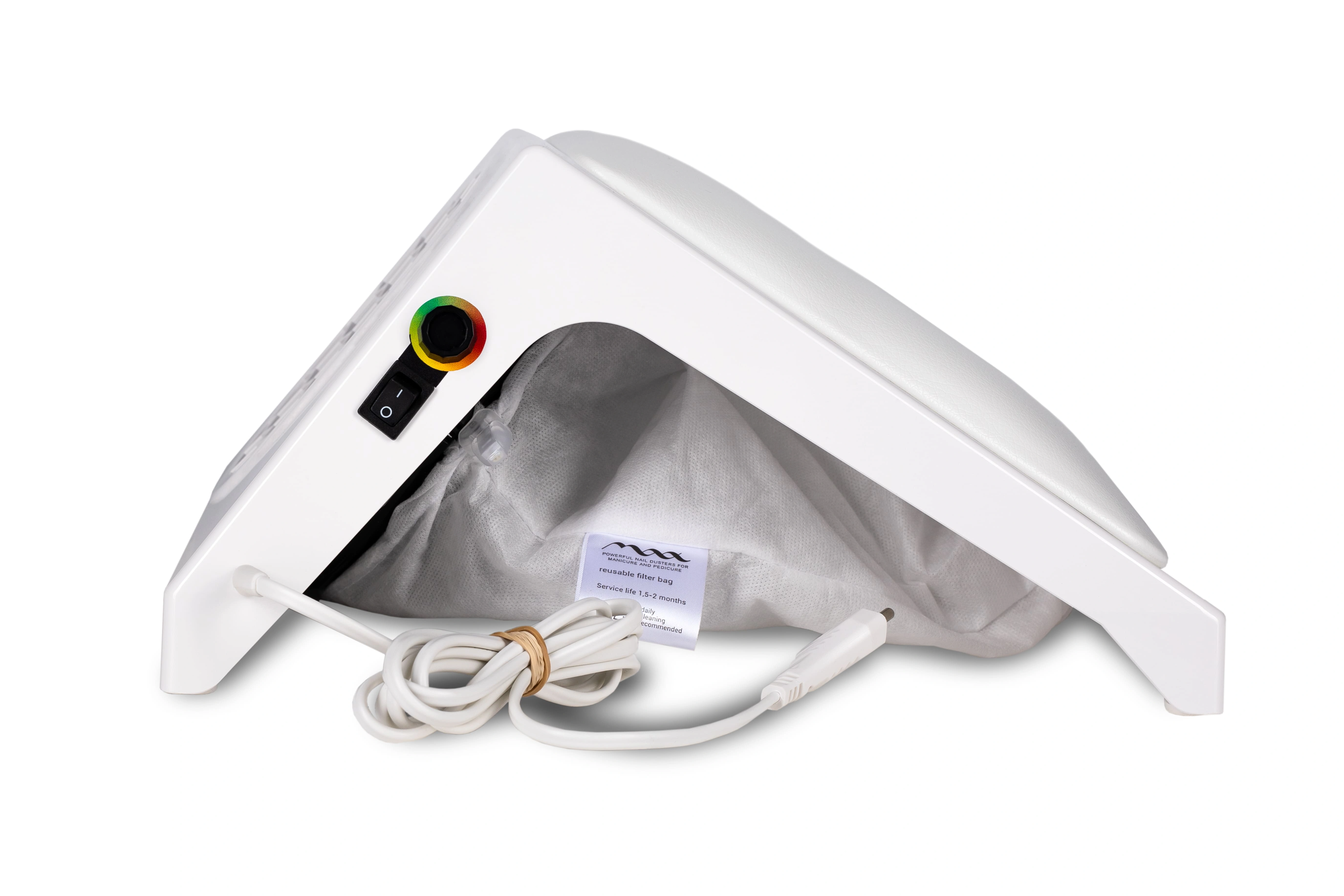 Маникюрная вытяжка Ultimate 7 с подушкой – это мощный пылесос в настольном исполнении с вентилятором производительностью 401 м3/час. Это в 5 раз больше, чем у других маникюрных пылесборников, в которых этот показатель равен 80 м3/час. Устройство разработано для мастеров маникюра, работающих в салонах красоты и на дому.