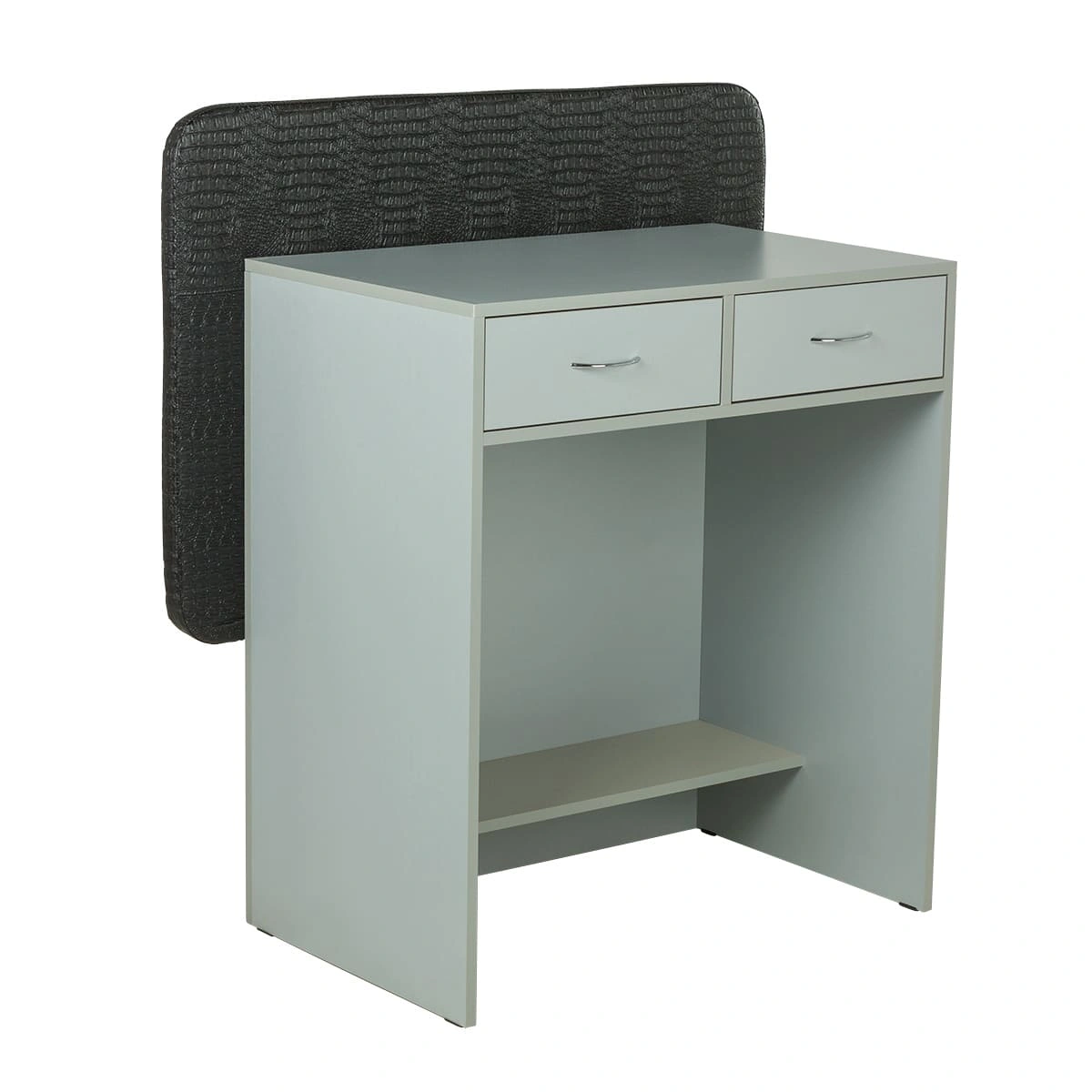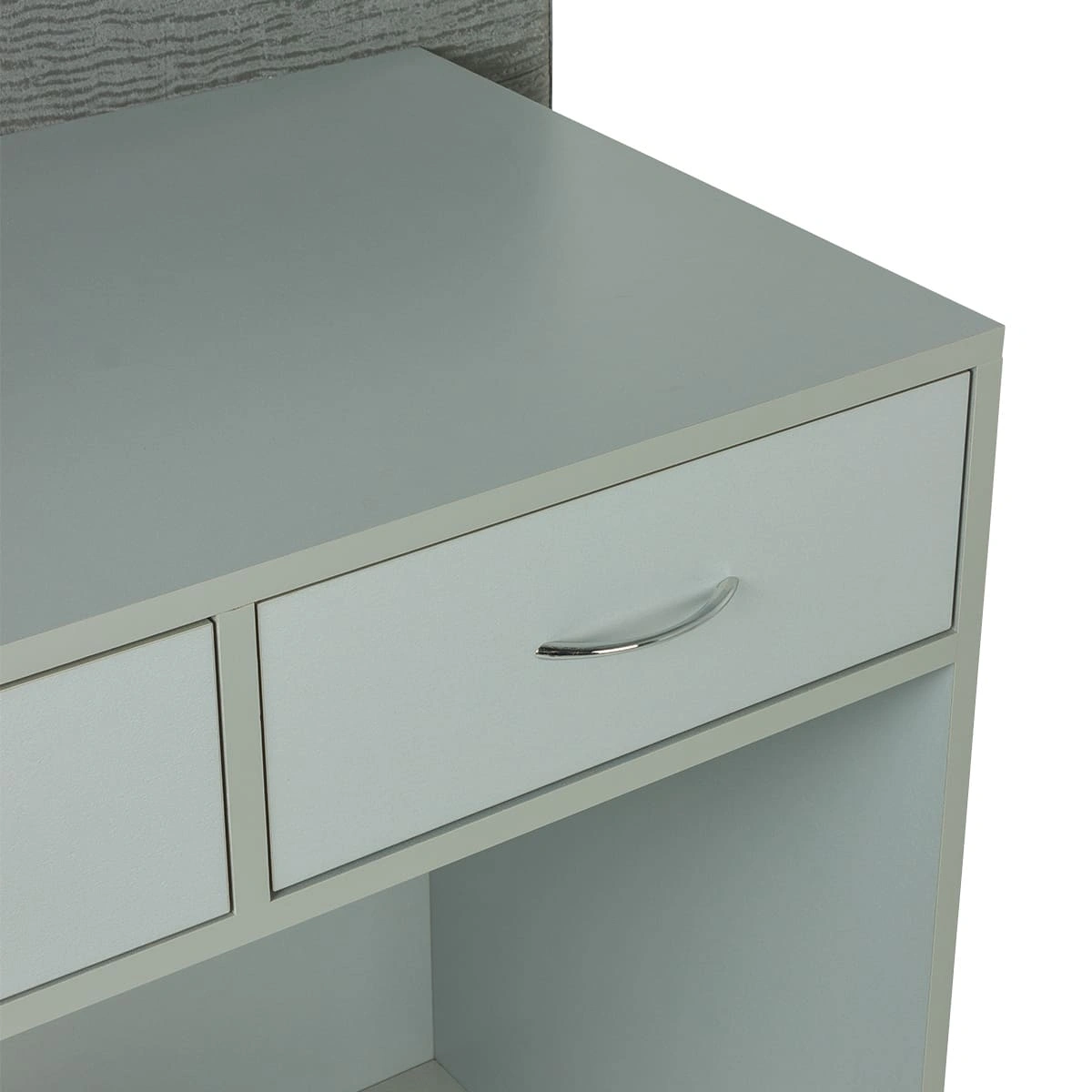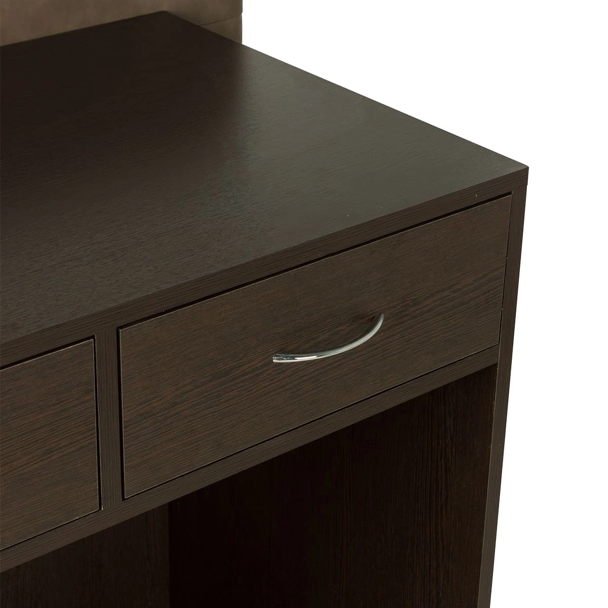 Стойка для администратора представляет собой двухстороннюю конструкцию. Внешняя часть, обращенная к клиенту, установлена выше уровня груди клиента. Благодаря этому посетителю не виден рабочий стол администратора и все, что на нем находится. Со стороны работника салона находится стол, на котором можно сложить необходимые документы, установить ноутбук и телефон. В двух выдвижных ящиках достаточно места для необходимых канцелярских предметов и личных вещей.