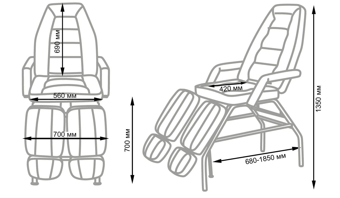 Кресло при необходимости можно разложить до горизонтального положения. Дополнительные подушки для стоп могут выдвигаться, удлиняя размер подножек. Это особенно удобна для посетителей высокого роста. Ножная часть раздельная. Каждая подножка может опускаться до 90 градусов, а подниматься на высоту до 1 метра. Регулировка высоты позволит мастеру подобрать оптимальное положение для каждого клиента.