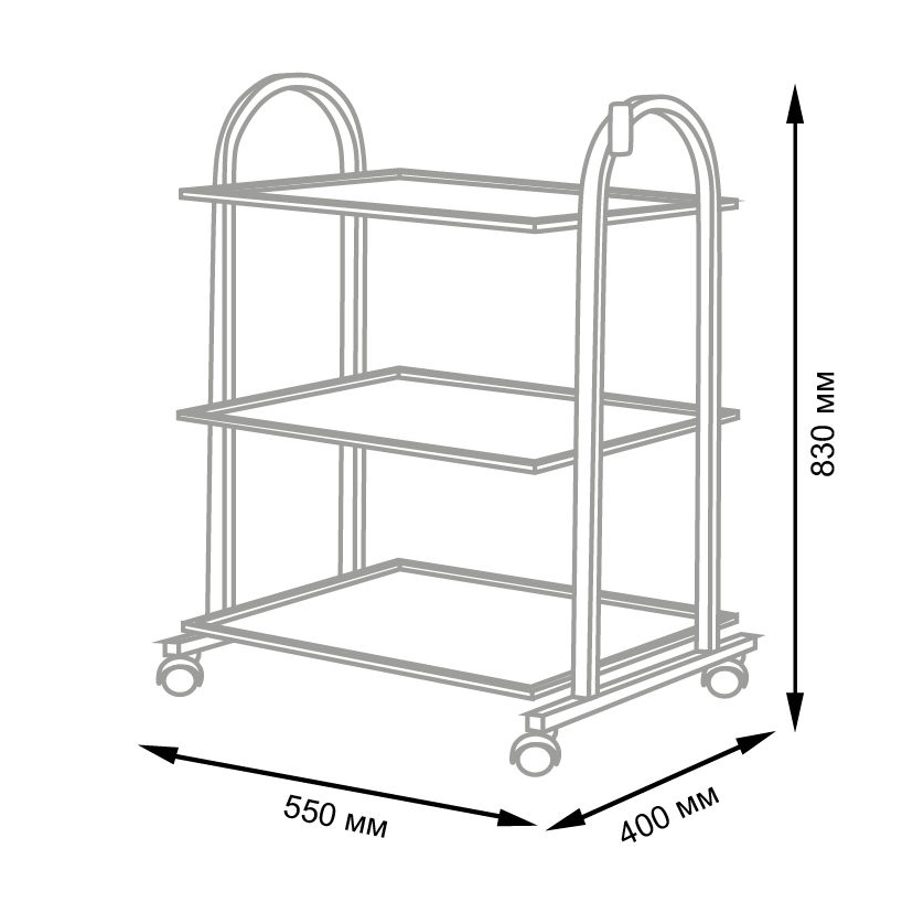 Комплектация: металлический каркас, три полки с бортиками, пластиковые колёса (4 штуки).