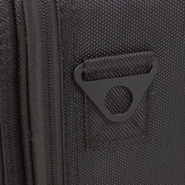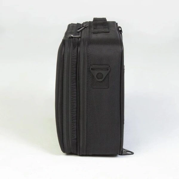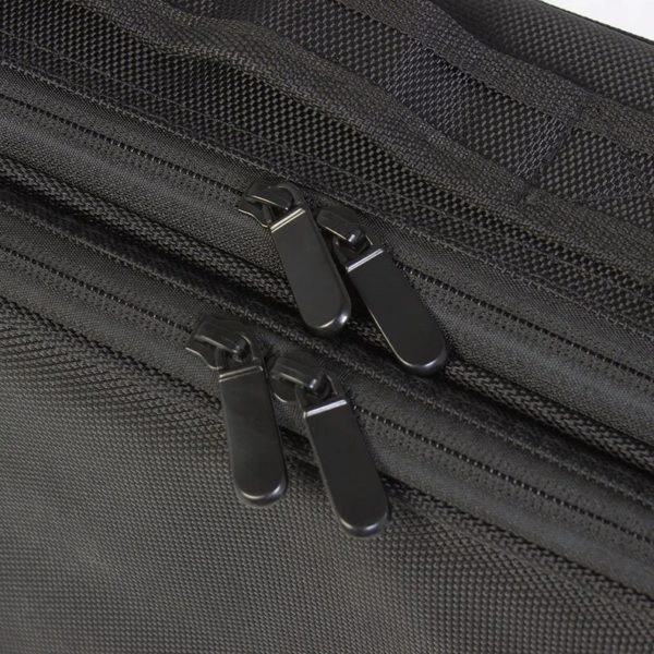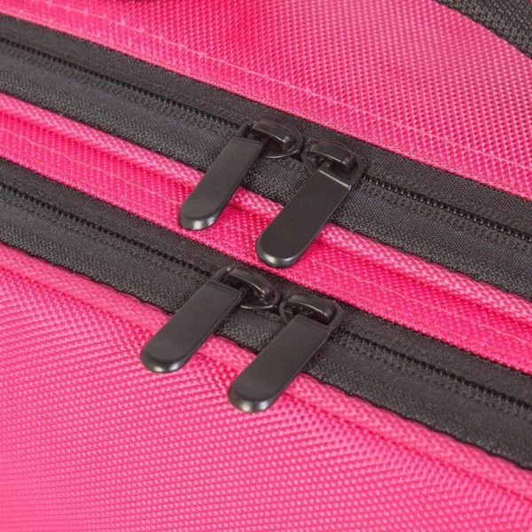 Сумка разделена на два отделения. Первый отсек – карманы на молнии и специальные съемные перегородки, которые можно переставлять и регулировать размер ячеек. Внутри второго отдела есть сетчатый карман на молнии и место для кистей. В комплект входит съемный регулируемый ремень, благодаря чему сумку можно носить на плече. Съемный ремешок можно хранить в заднем кармане саквояжа.