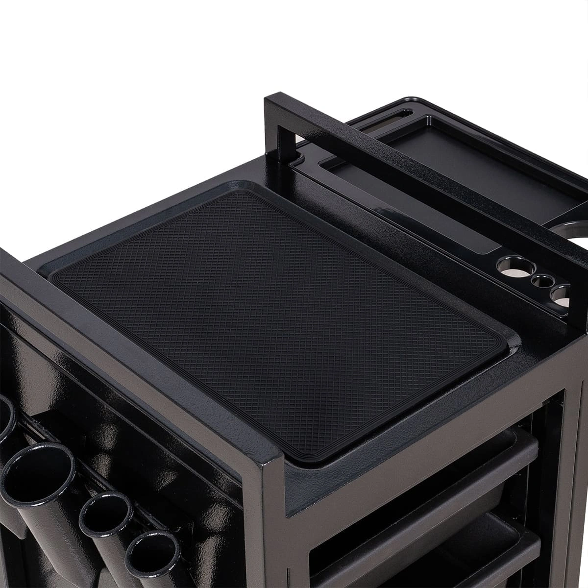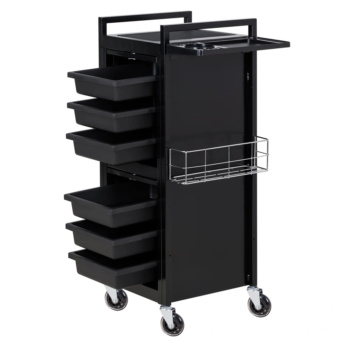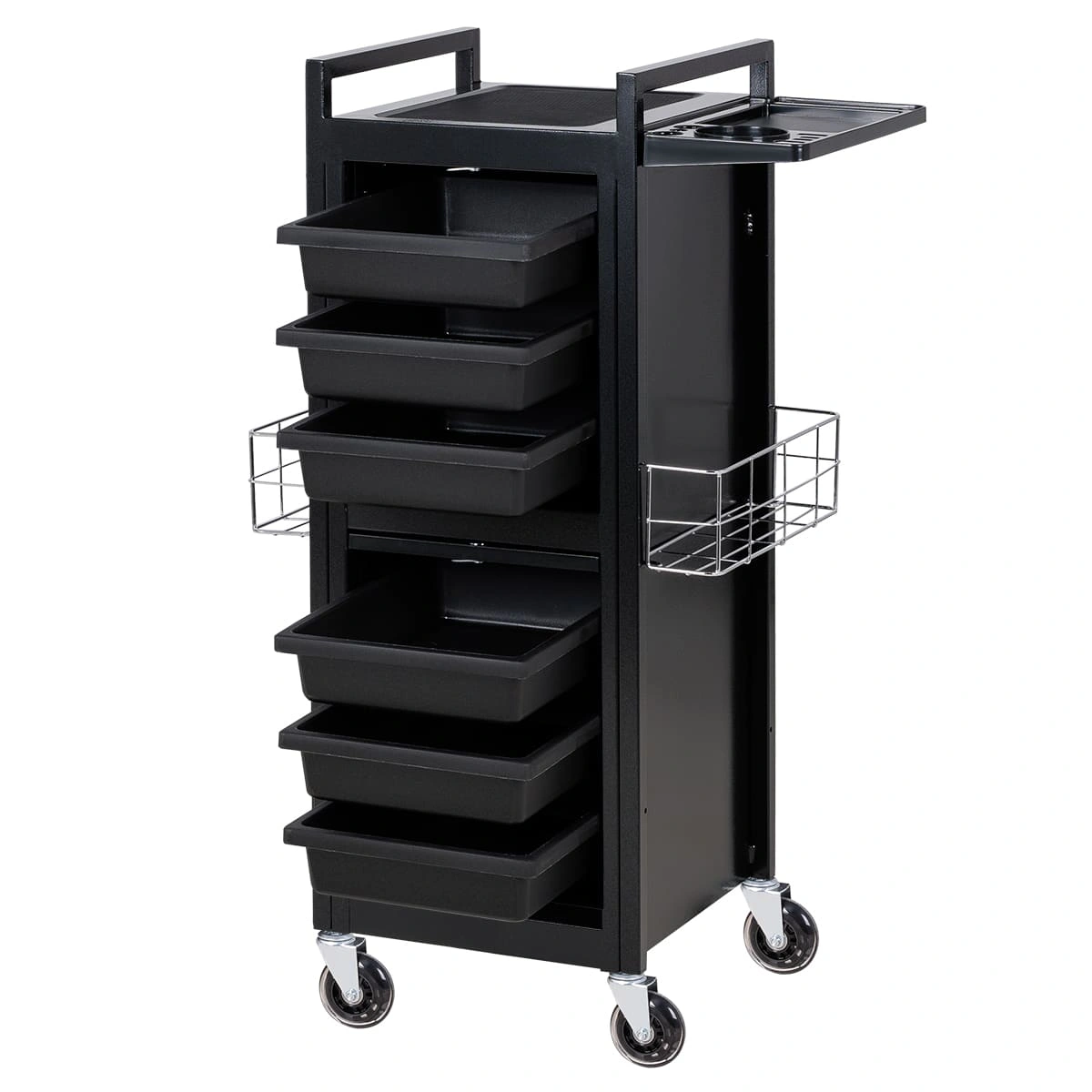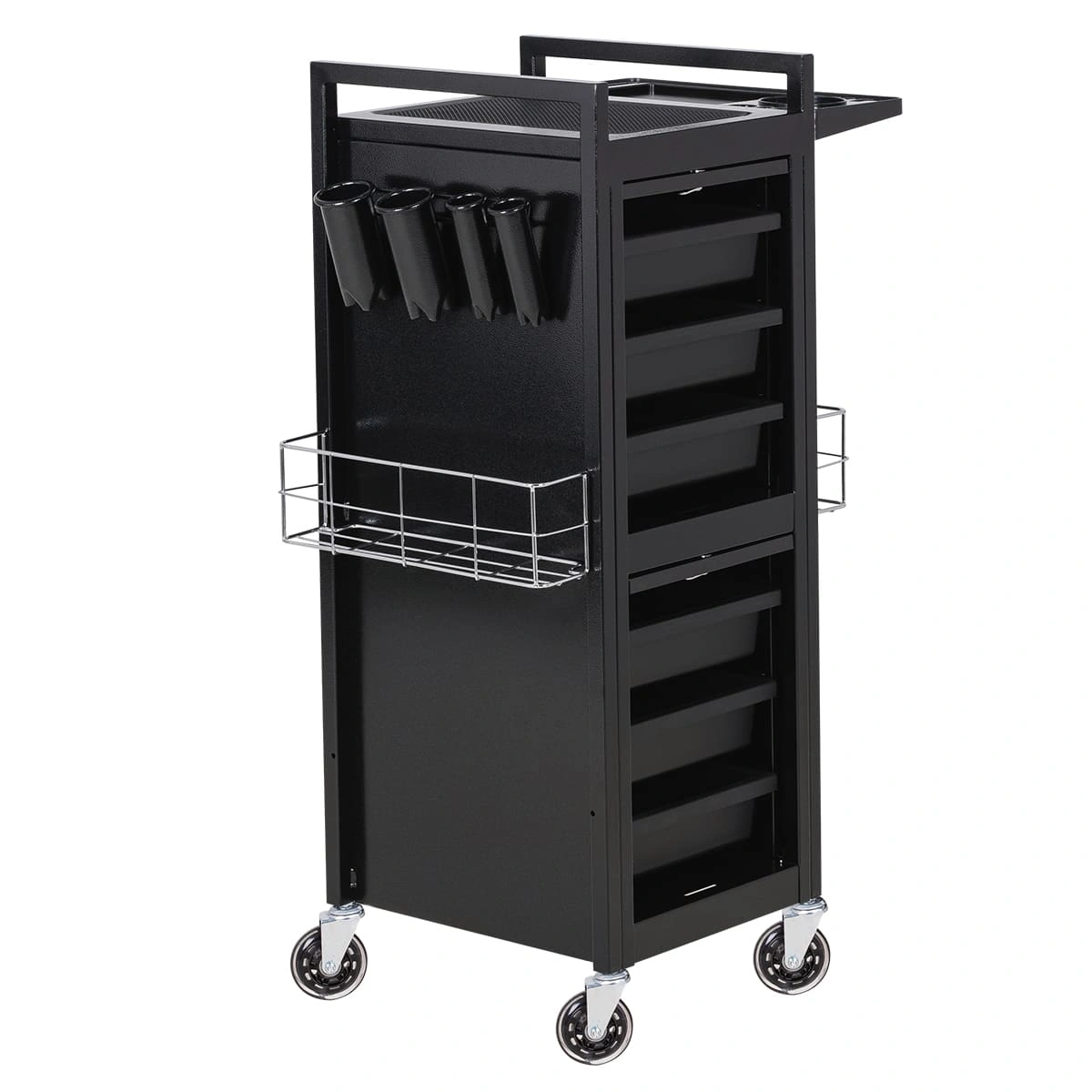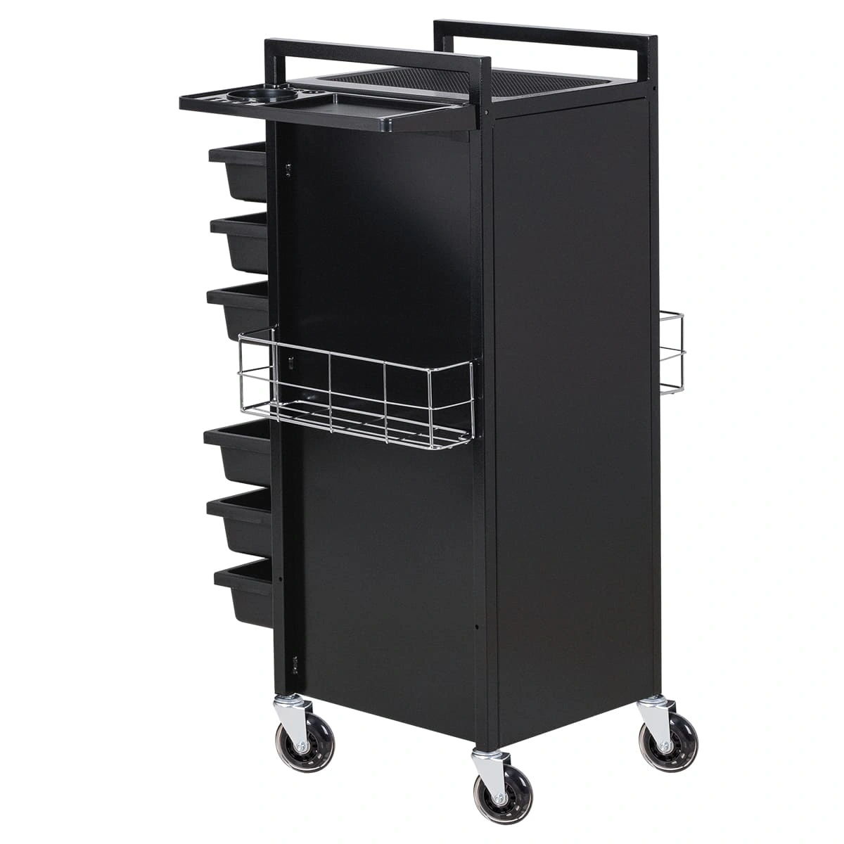 У парикмахерской тележки стильный прямоугольный дизайн с острыми углами. Верхняя многофункциональная полочка с ручками для перемещения, антискользящей ребристой поверхностью, держателем для фена и отверстиями для красок, брашингов и инструментов. Шесть выдвижных ящиков, закрывающихся на ключ, и боковые съемные сетки для хранения рабочих принадлежностей. Боковины и задняя стенка полностью закрывают внутреннее пространство для ящиков, что делает тележку практичной и удобной в работе.