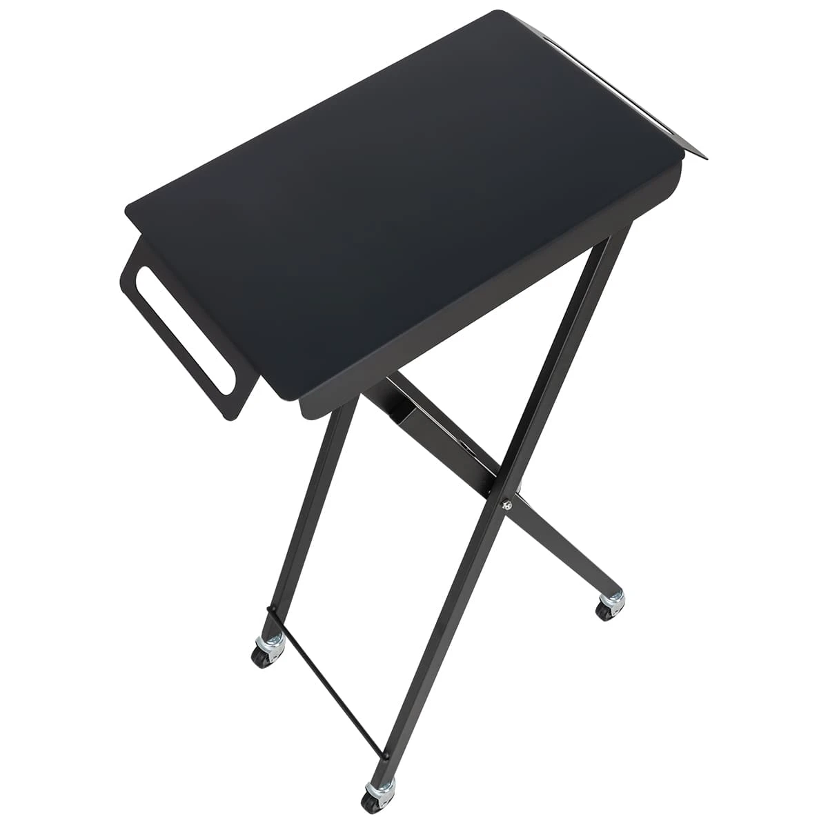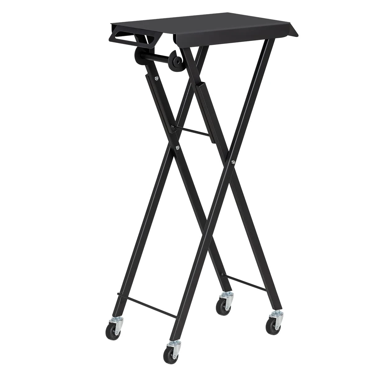 Верхняя часть тележки – плоская металлическая крышка с 3 магнитными чашами в комплекте. Сбоку вращающийся ролик для фольги, а боковые стороны столешницы имеют зубцы для её аккуратной и быстрой резки. Основание на 4 манёвренных колесах.