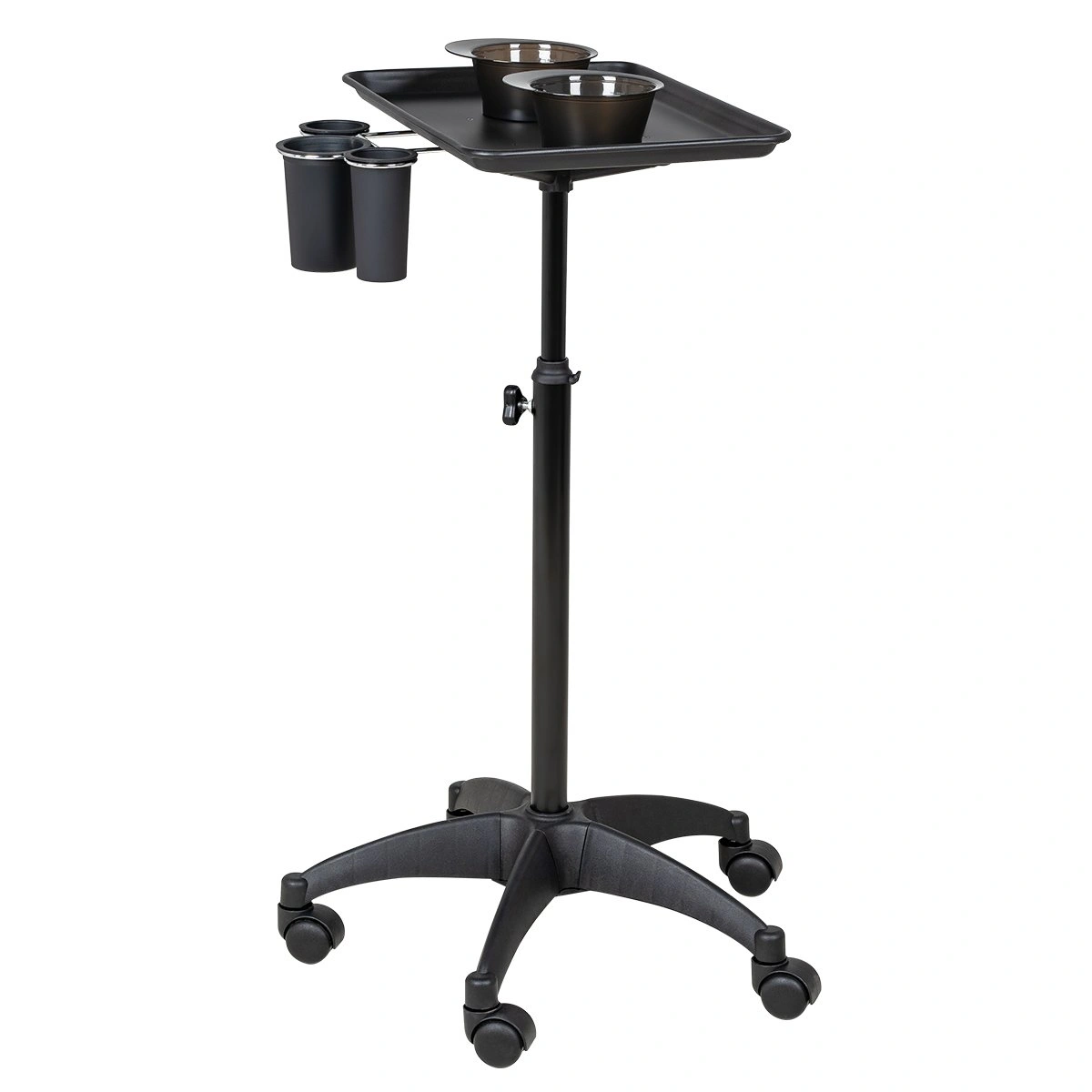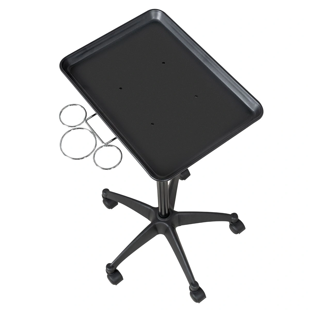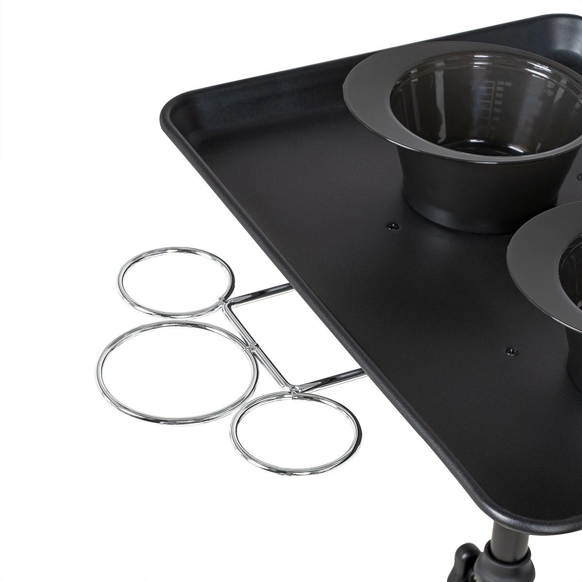 Каркас тележки изготовлен из прочного металла, благодаря пластиковому пятилучью на колесиках ее легко перемещать. Специальное хромированное покрытие надёжно защитит от коррозии. Верхняя часть тележки – металлическая крышка на чёрной матовой трубе с магнитными чашами и удобным держателем для ёмкостей, что весьма удобно не только для работы, но и после неё, чаши легко моются. Материал оборудования устойчив к моющим и дезинфицирующим средствам, а также не деформируется от воздействия агрессивных продуктов.