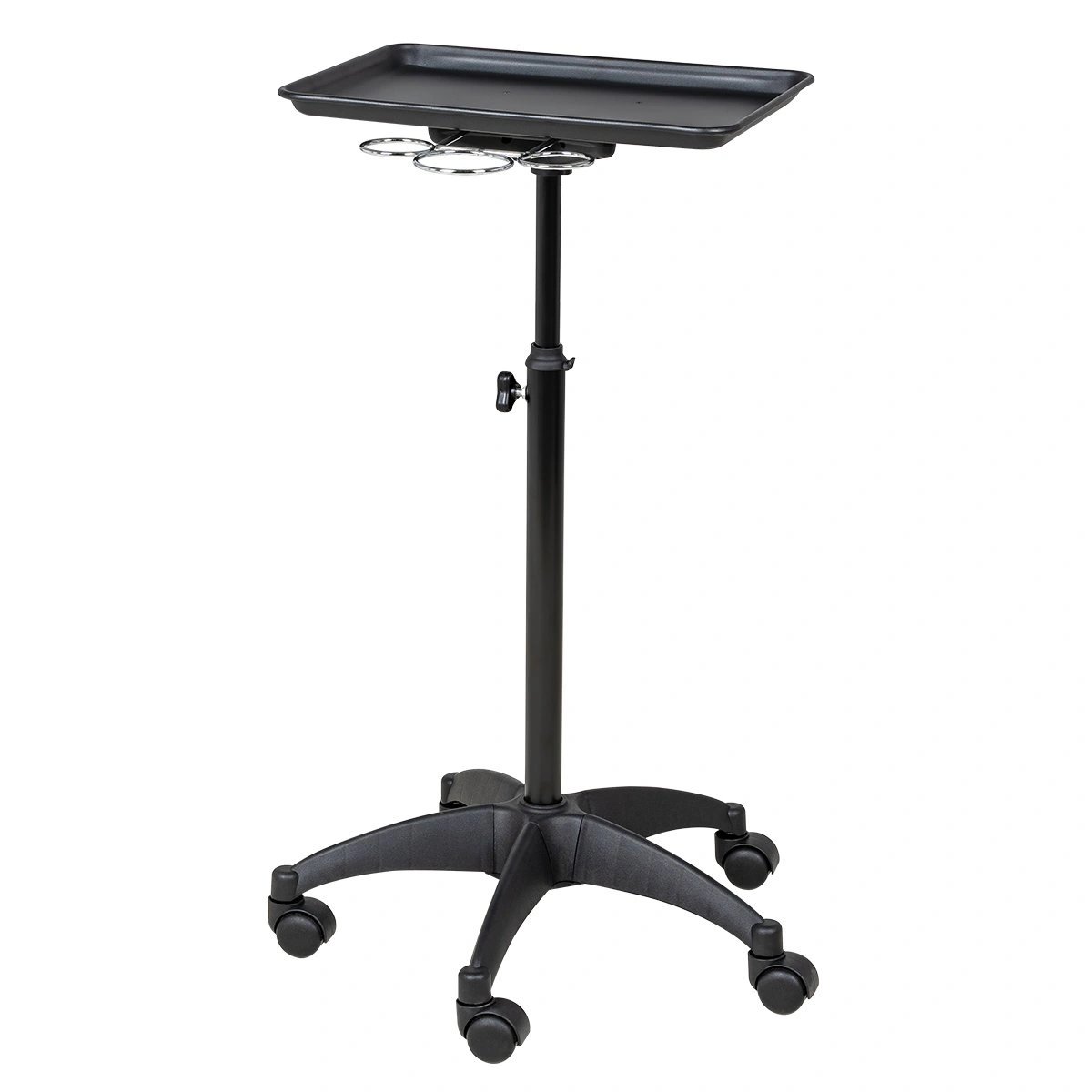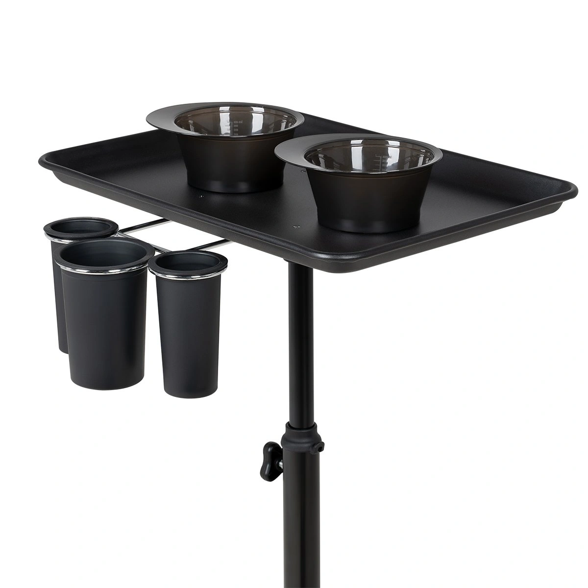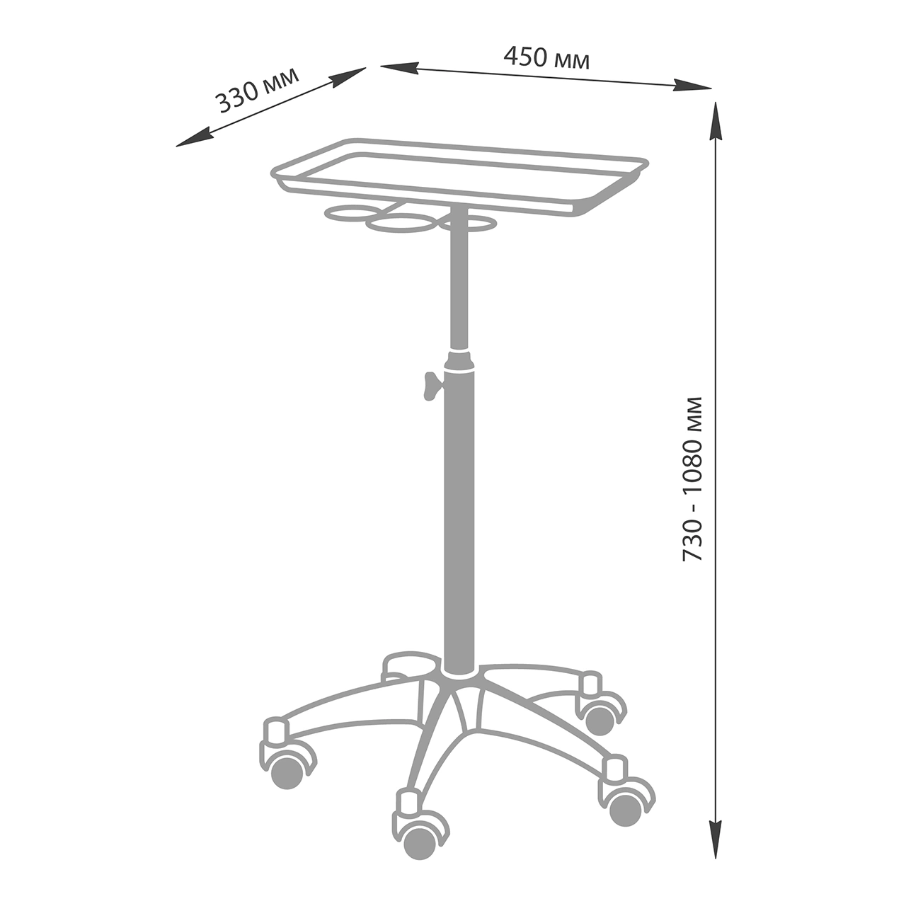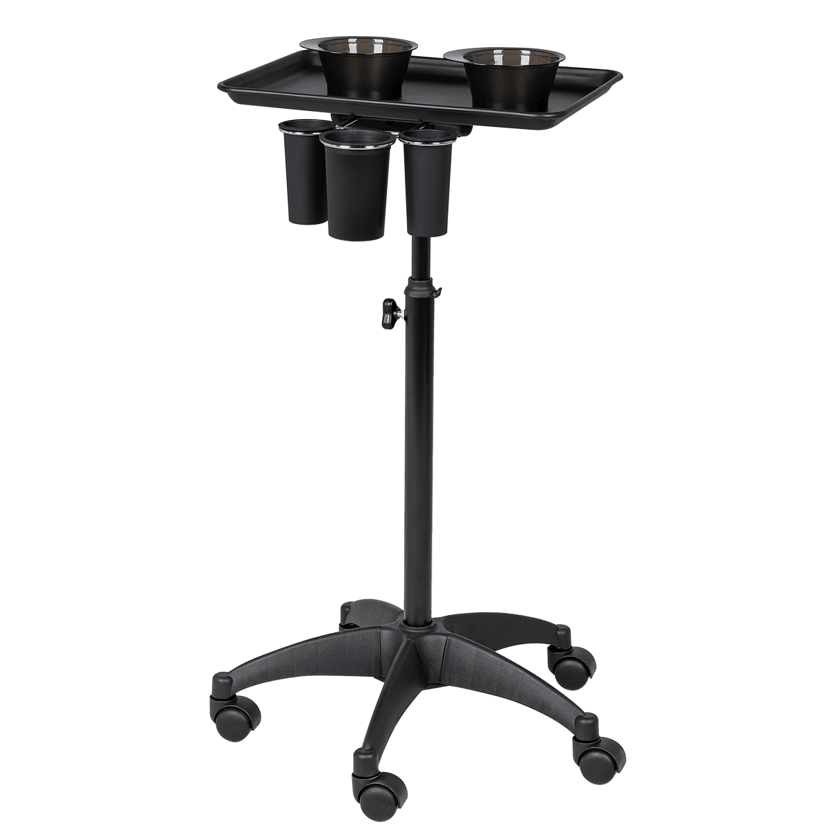 Каркас тележки изготовлен из прочного металла, благодаря пластиковому пятилучью на колесиках ее легко перемещать. Специальное хромированное покрытие надёжно защитит от коррозии. Верхняя часть тележки – металлическая крышка на чёрной матовой трубе с магнитными чашами и удобным держателем для ёмкостей, что весьма удобно не только для работы, но и после неё, чаши легко моются. Материал оборудования устойчив к моющим и дезинфицирующим средствам, а также не деформируется от воздействия агрессивных продуктов.