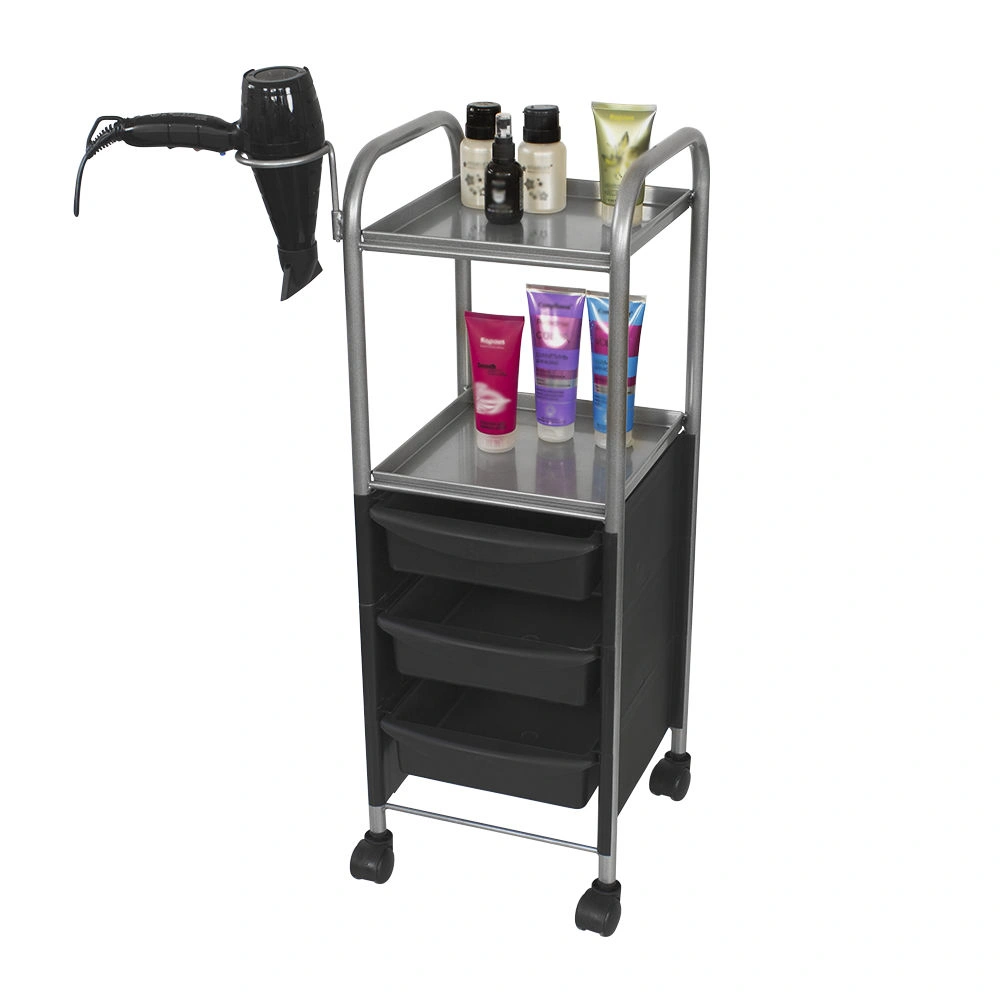 Наличие бортиков убережет инструмент от случайного падения. Практичное дополнение парикмахерской тележки – удобный держатель для фена. Оборудование можно переместить в любую точку салона благодаря манёвренным колесикам.