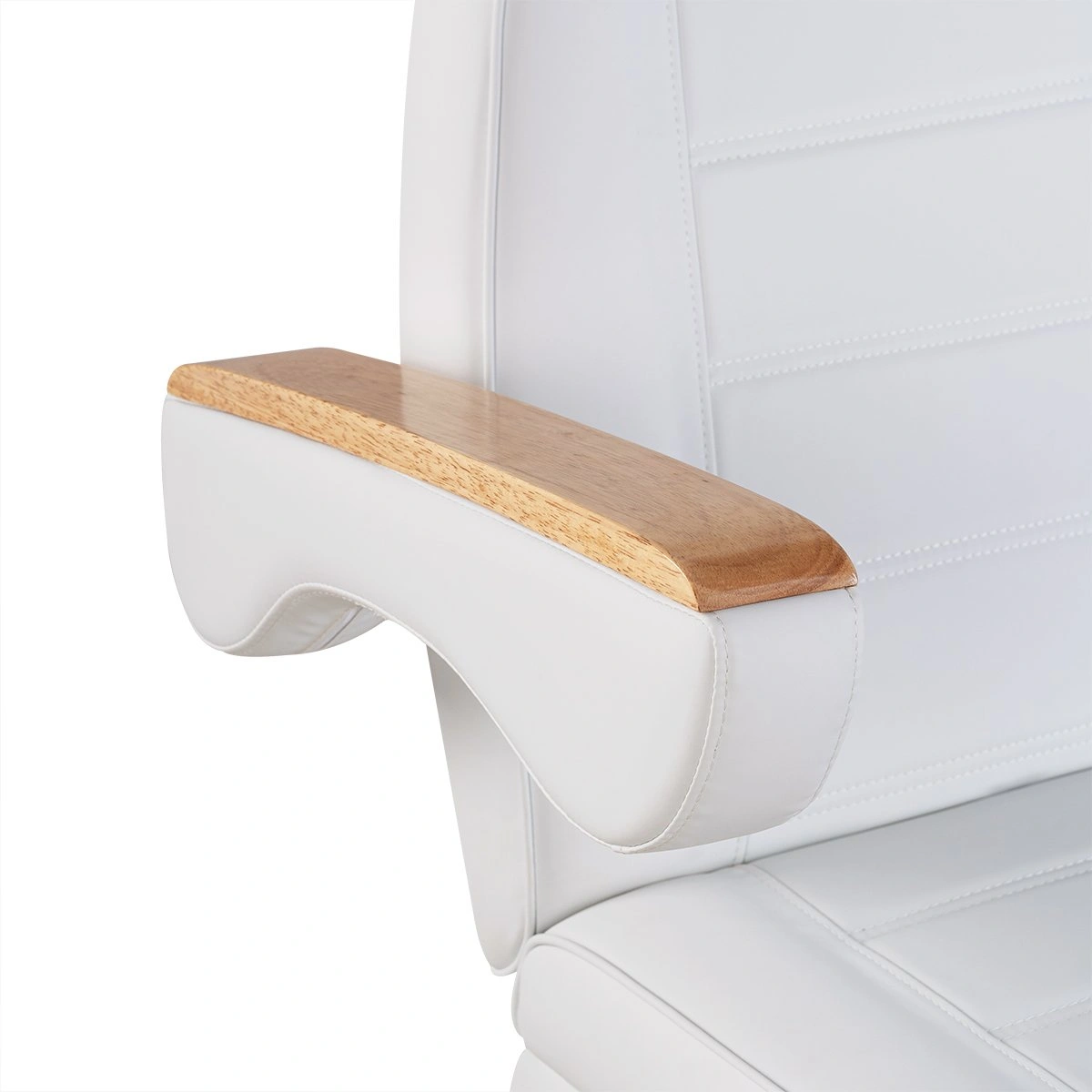Кресло имеет устойчивое широкое основание, конструкция полностью раскладывается в горизонтальное положение, имеются выдвижной подголовник с отверстием для лица, которое при необходимости можно закрыть мягкой подушкой и съёмные подлокотники со стильными деревянными вставками. Модель можно использовать для различных процедур: педикюр, наращивание ресниц, косметология, оформление бровей и т.д.