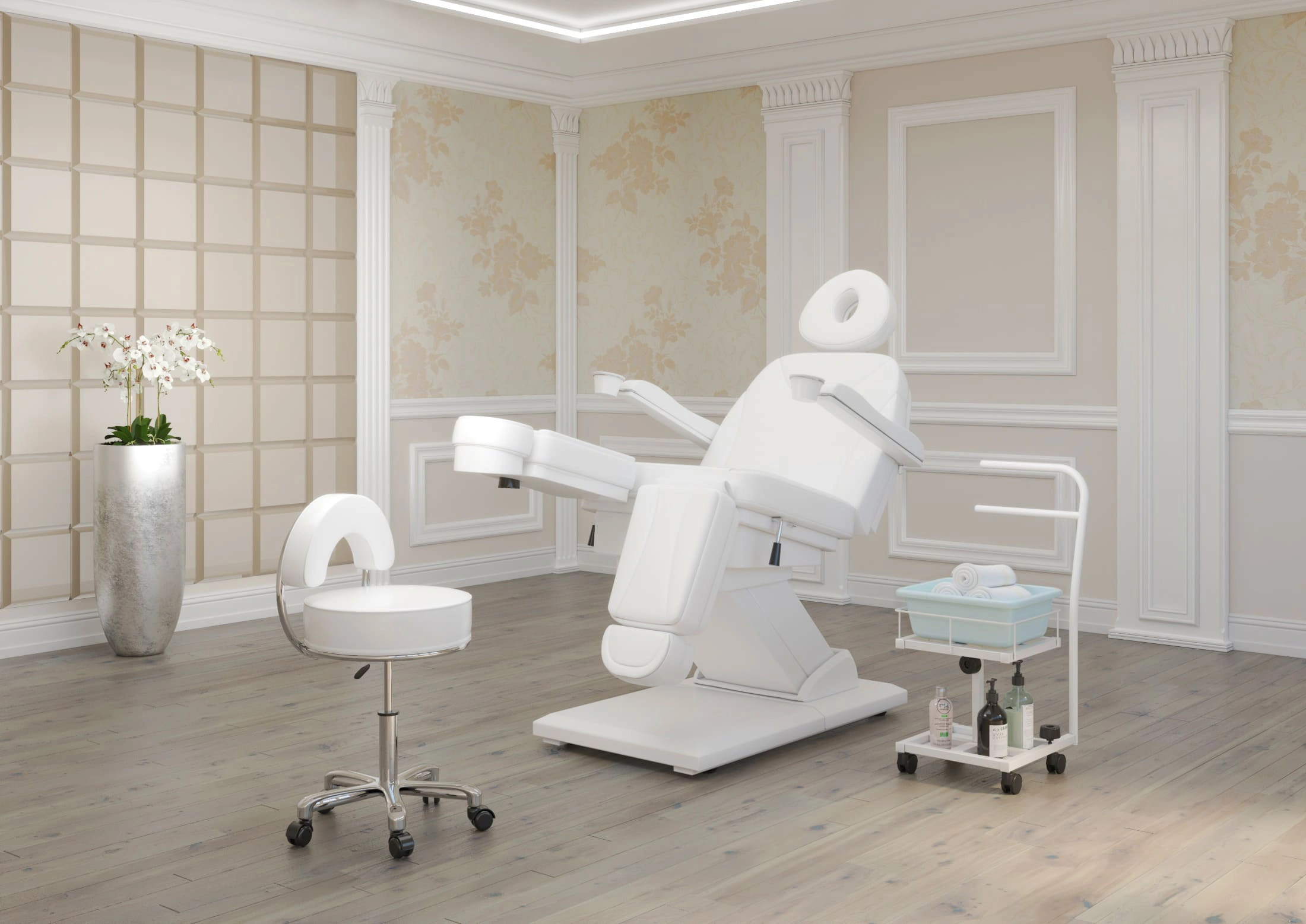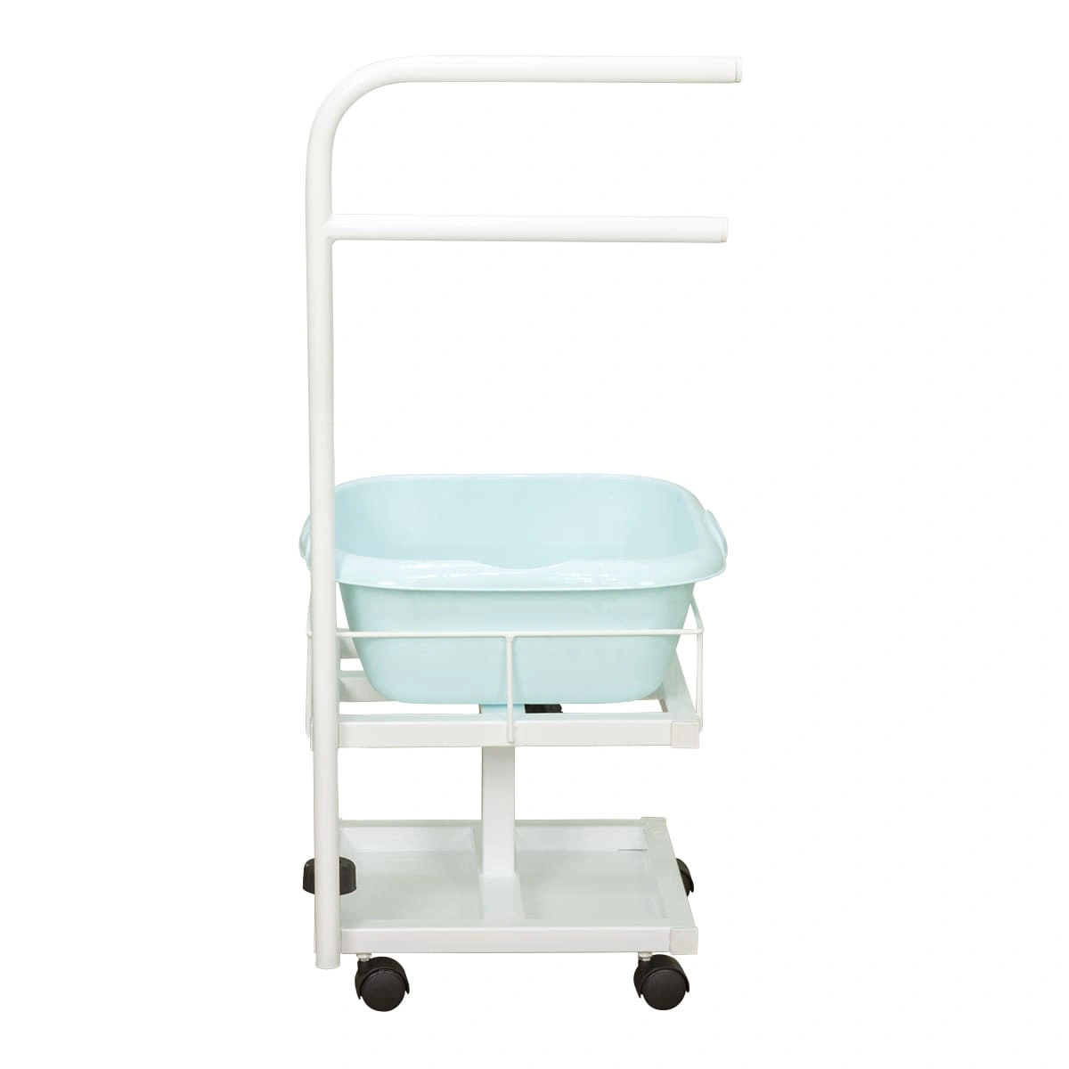 Благодаря двухъярусной конструкции можно установить не только ванную, но также необходимые инструменты и приспособления. Ванночка снимается для чистки и дезинфекции. Удобную ручку можно использовать как для перемещения педикюрного оборудования, так и для развешивания полотенец. Встроенные колеса обеспечивают маневренность и бесшумность передвижения по любому типу напольного покрытия.