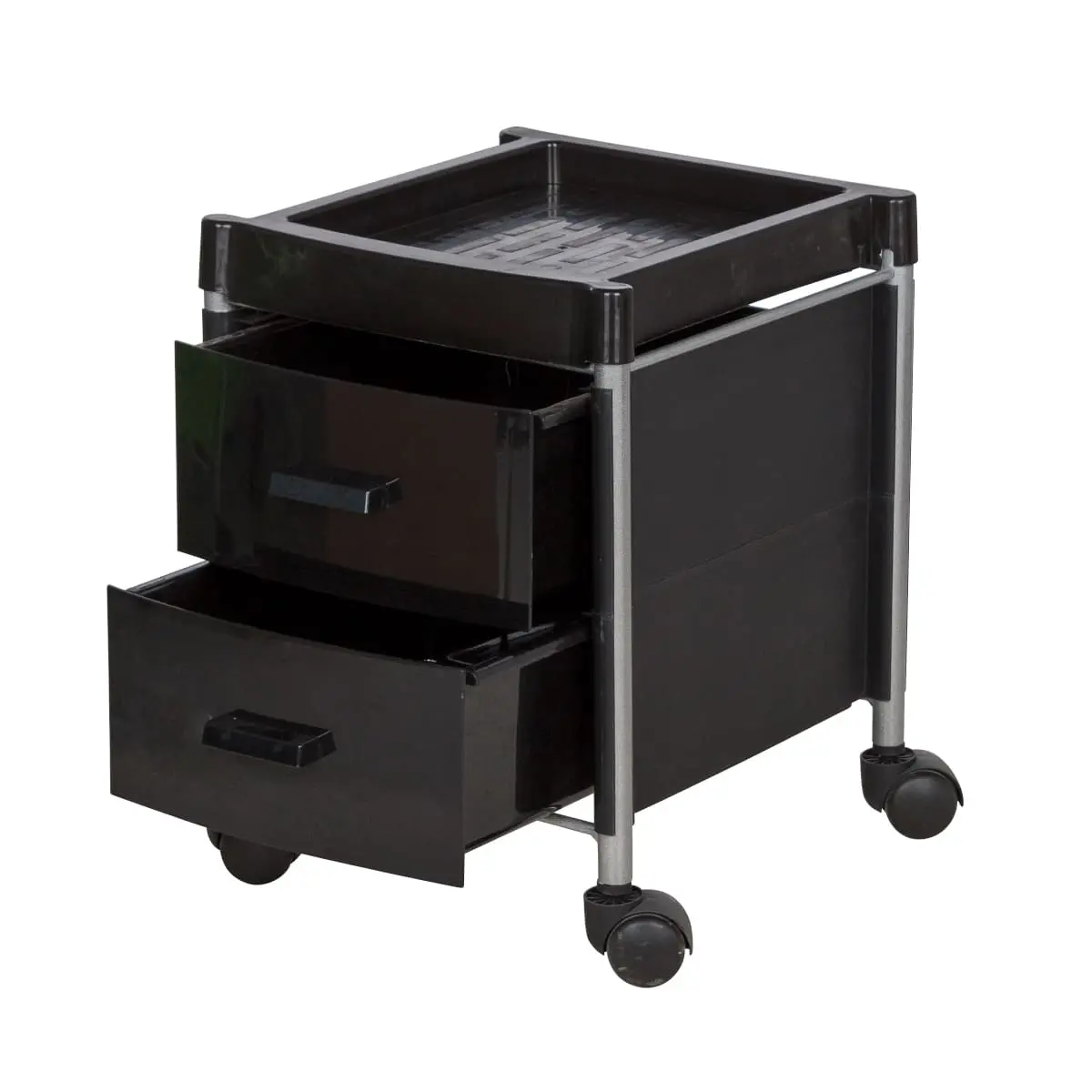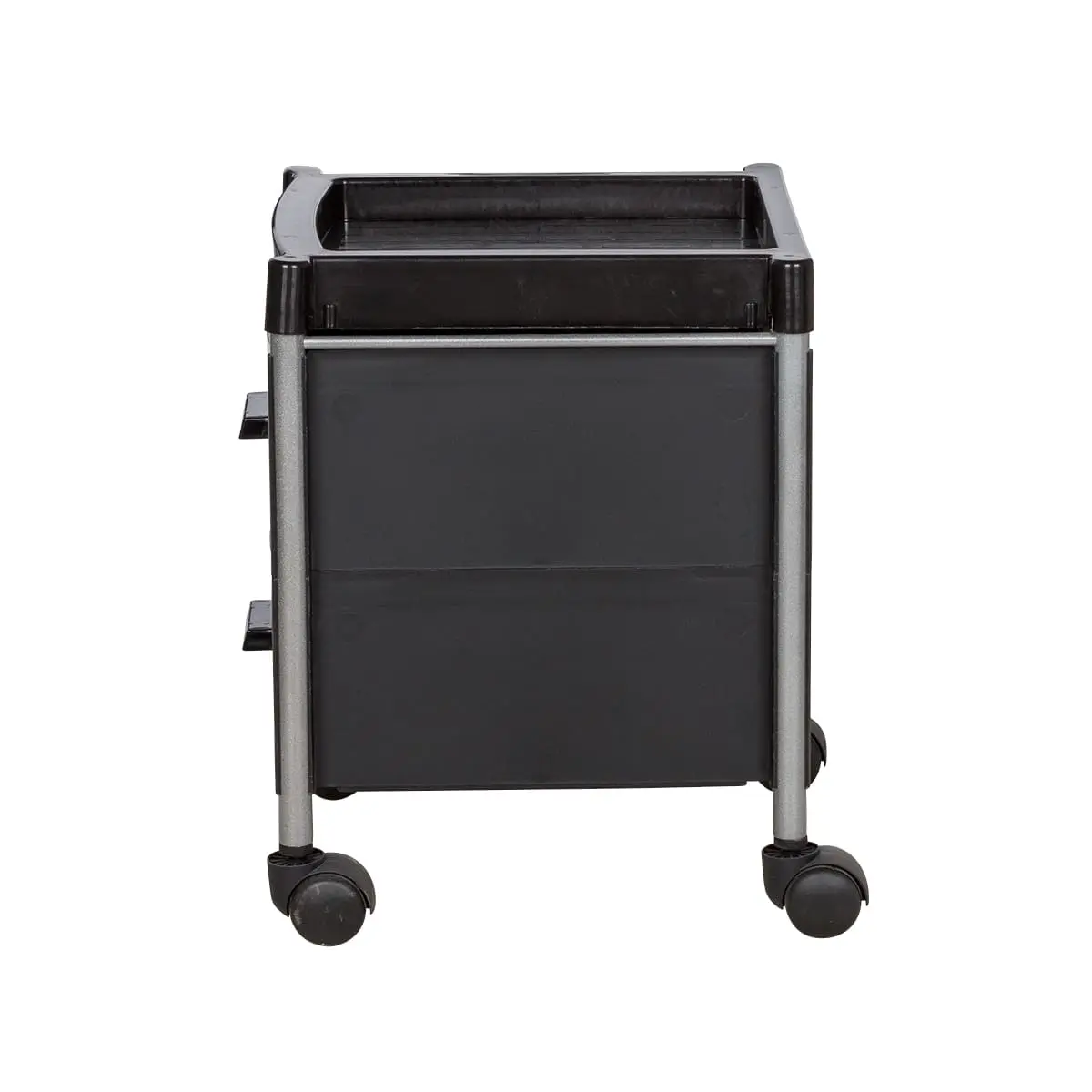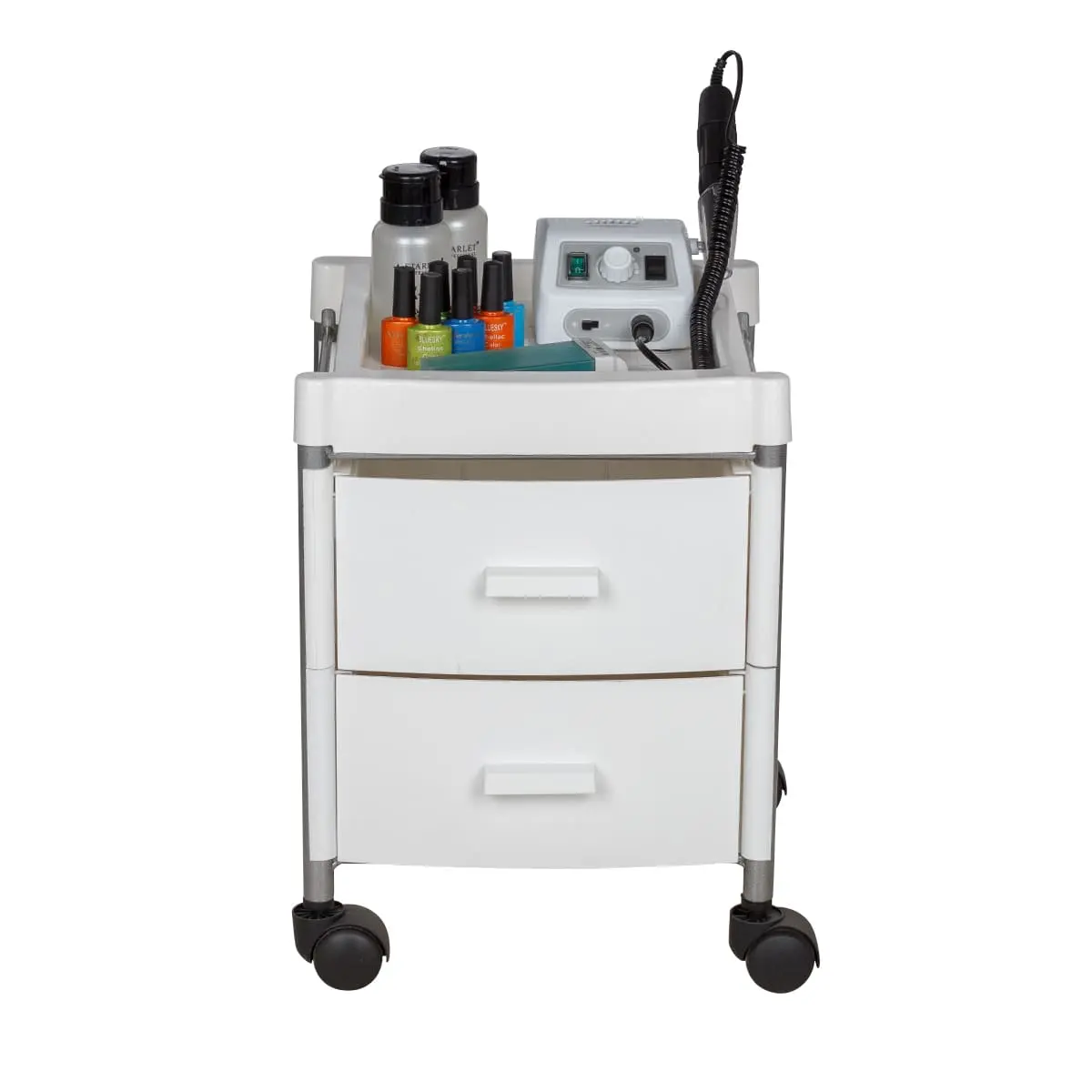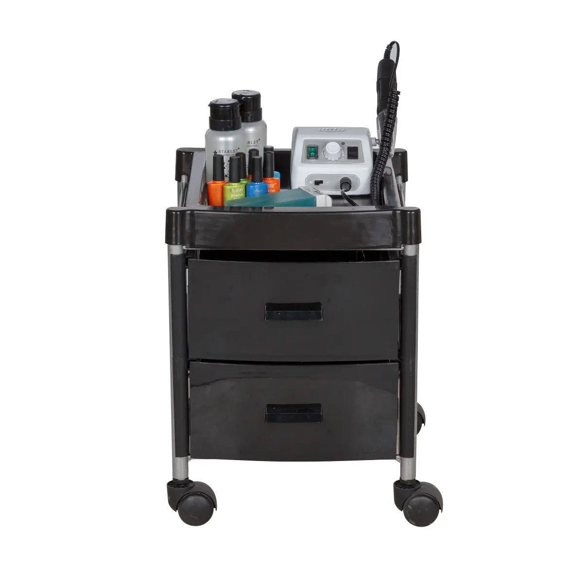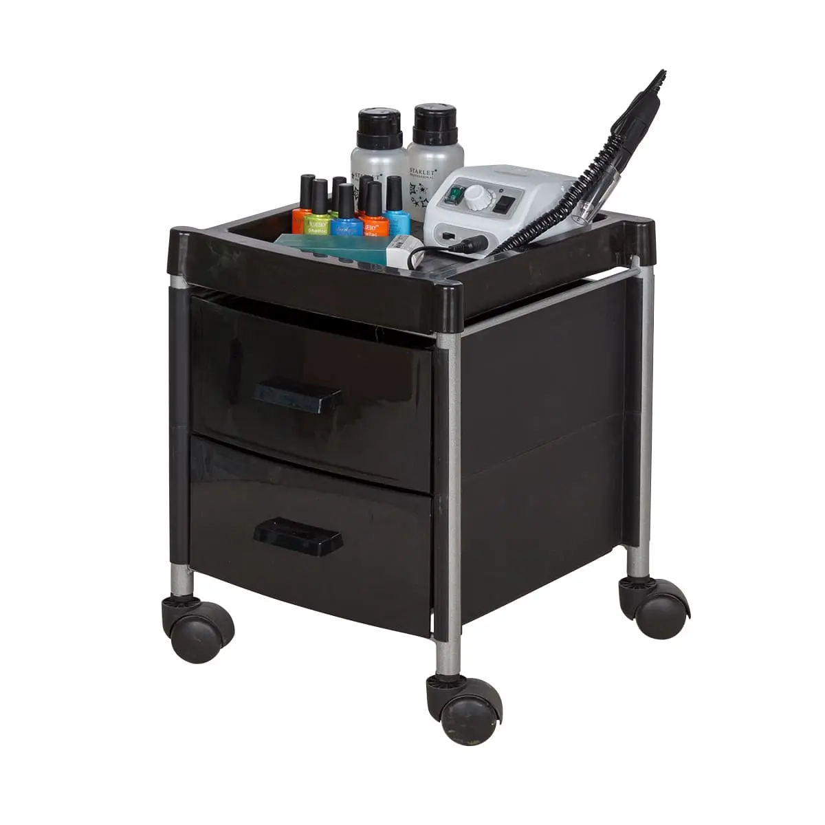 Тележка укомплектована двумя вместительными ящиками. Для инструментов, используемых во время рабочего процесса, на тележке предусмотрена крышка. Для быстрого и бесшумного перемещения, тележка для педикюра оснащена четырьмя поворотными колесами. Благодаря компактным размерам тележка может быть использована даже в небольшом кабинете.