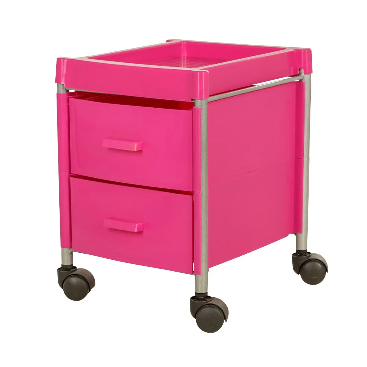 Каркас изготовлен из прочных металлических трубок. Боковые панели и ящики выполнены из качественного пластика. Износоустойчивый материал хорошо моется и очищается дезинфицирующими средствами. Верхняя полка из металла не боится влияния влаги и коррозии.