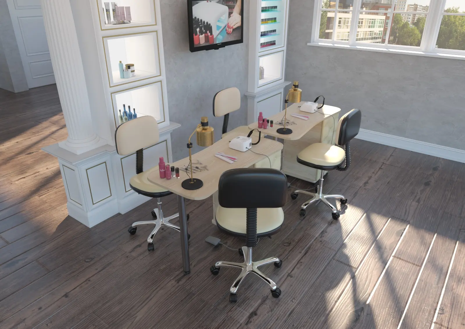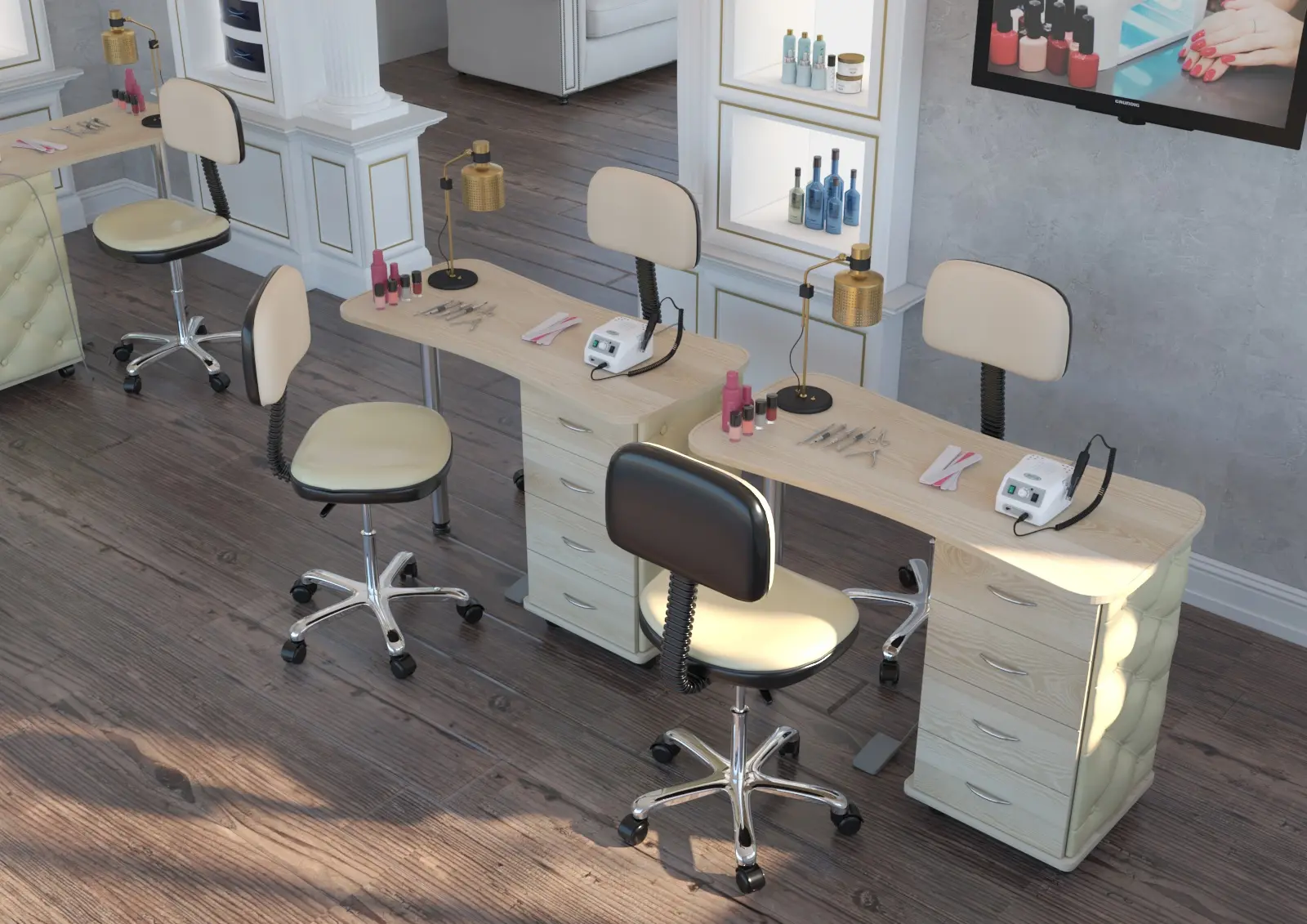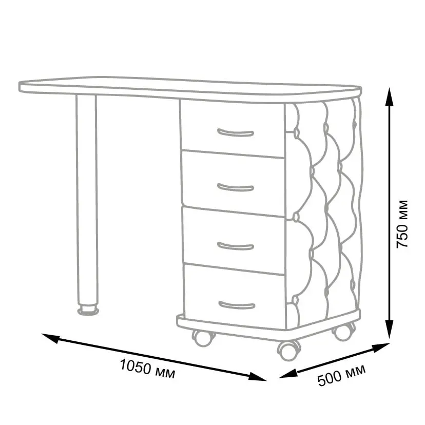 Комплектация: столешница, тумба, четыре выдвижных ящика, стальная ножка, колеса.